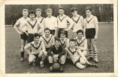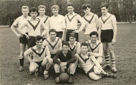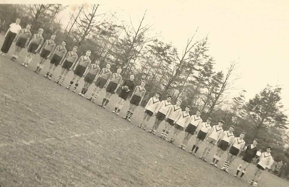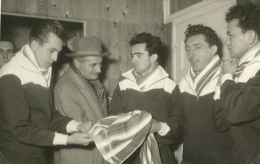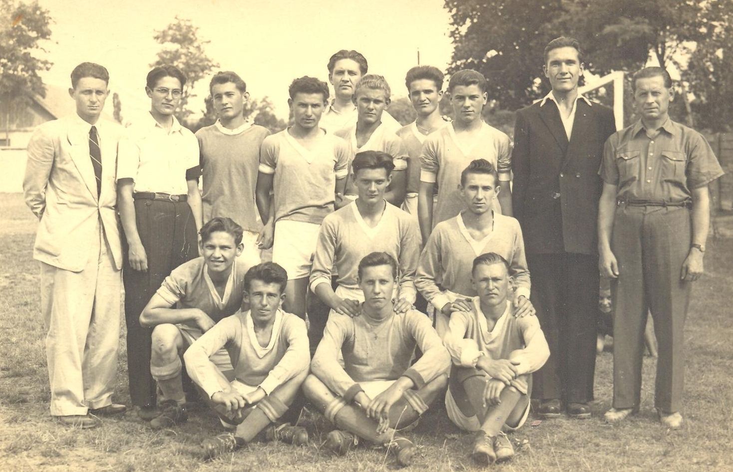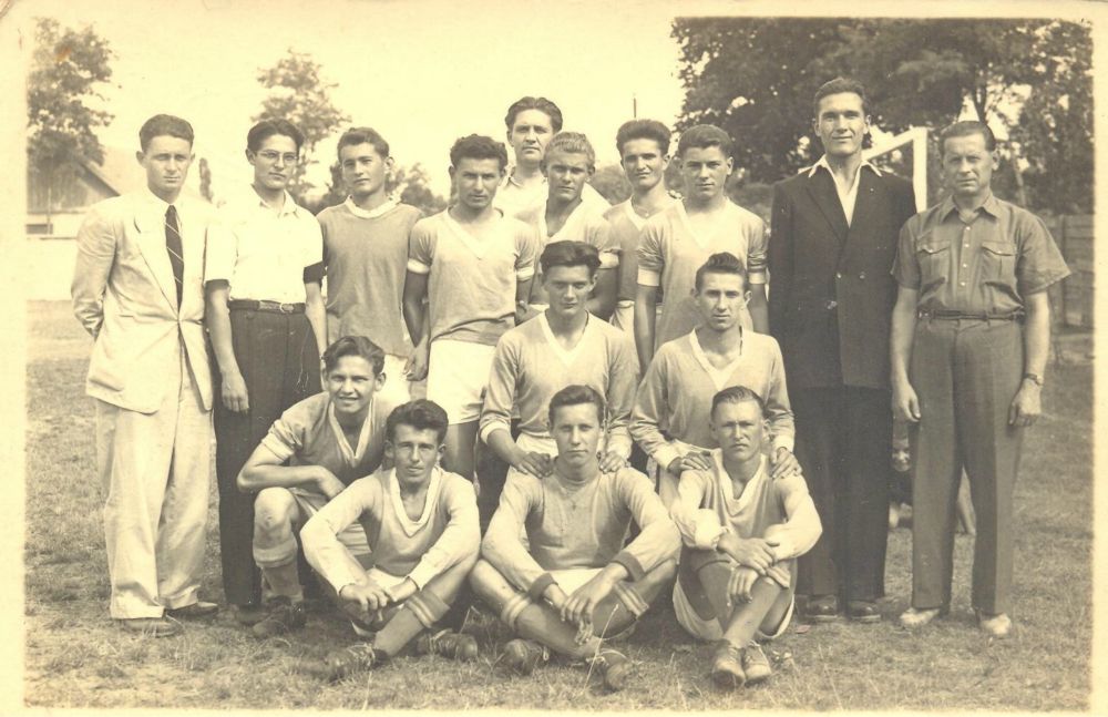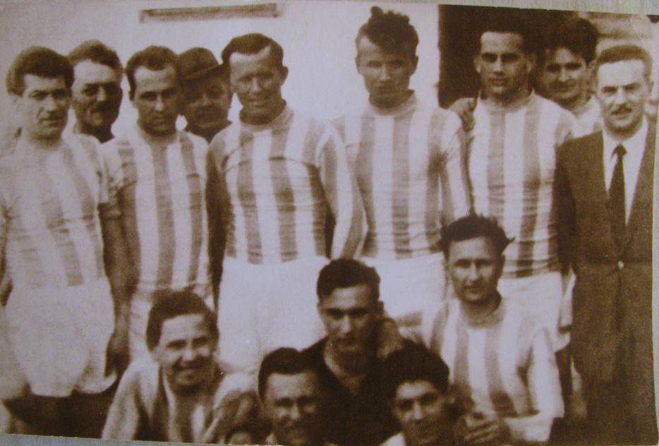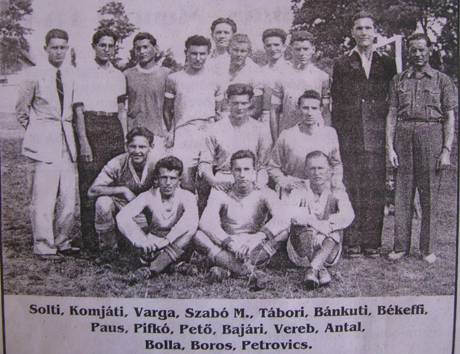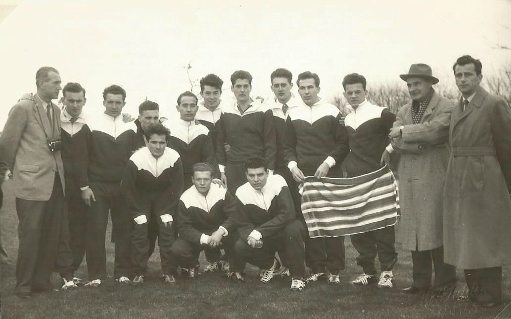 Hátsó sor: Második jatékos Béres András kilencedik játékos Tódór Miklos. Első sor: Első játékos Békeffy Jenő és a jobb szélen a világhírű futball szakemberek, Östreicher Emil és Ernst Happel.
