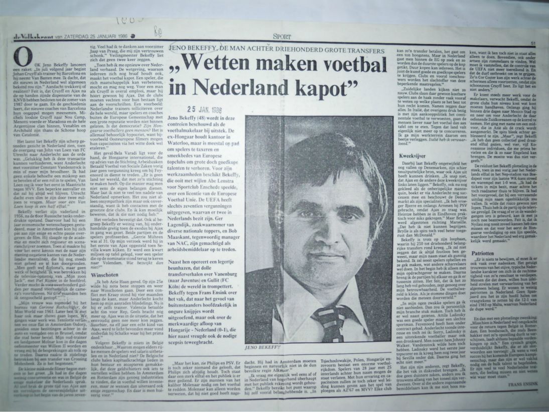 (de Volkskrant van zaterdag 25 januari 1986) Békeffy Jenő, első számú európai futball menedzser, 300 nagy átigazolással.